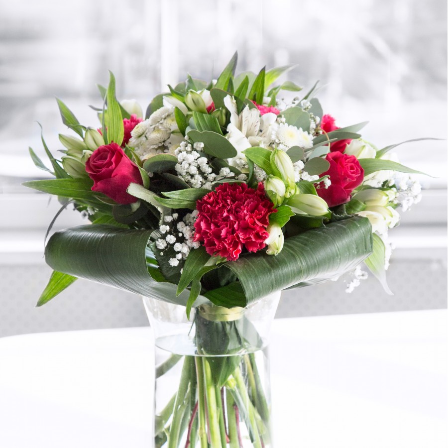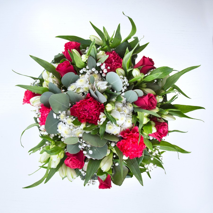 Indulge in the charm and elegance of our Charming White Delight bouquet. This exquisite arrangement features sweet white chrysanthemums and gypsophila, complemented by luxurious red roses and carnations, all set with white alstroemeria and aspidistra leaves.