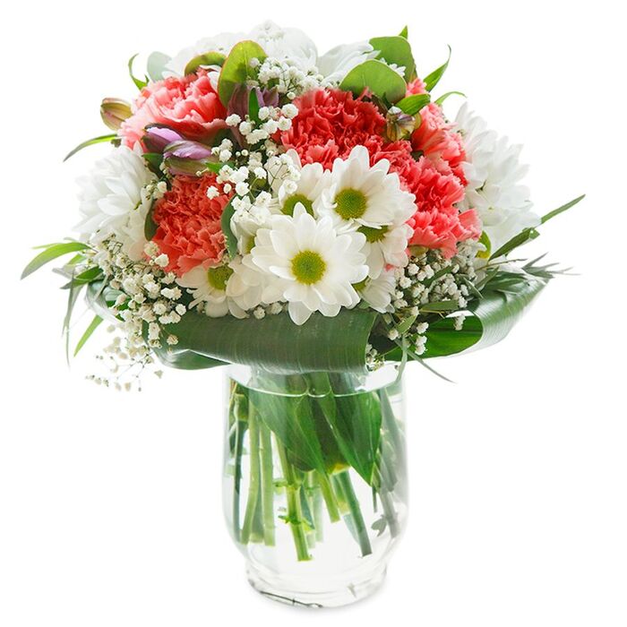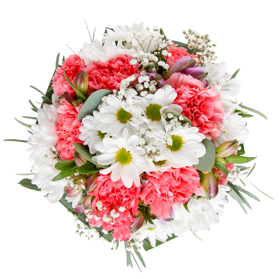 Brighten someone’s day with our beautiful and unique flower arrangement. This lovely bouquet showcases a soft color palette of white chrysanthemums, airy gypsophila, soft light pink carnations, and lush aspidistra leaves.